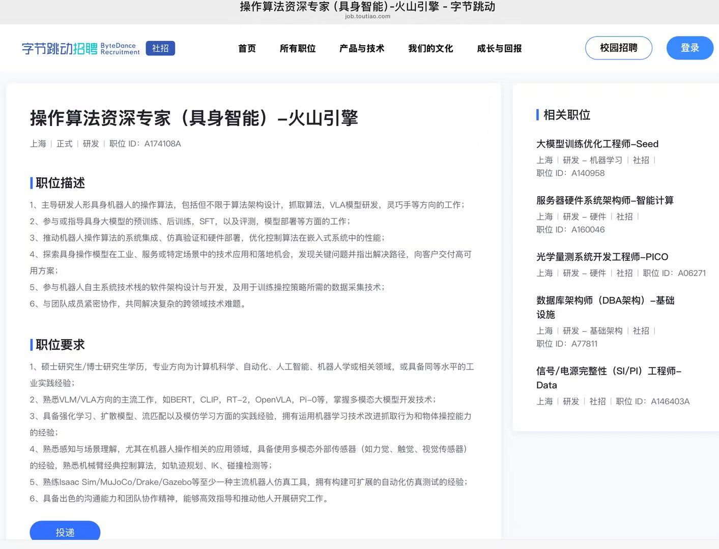 近日,字节跳动旗下火山引擎团队启动了一项高规格招聘,寻求“操作算法资深专家(具身智能)”。