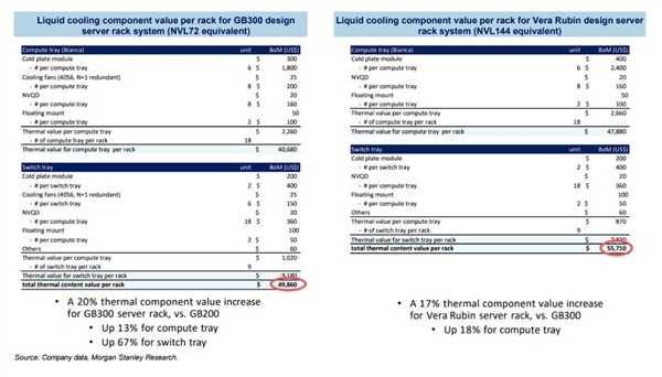 其中,每个计算托盘的散热成本增加18%,达到2660美元,其中更大容量的冷板成本增至400美元,而托盘总量不变,合计47880美元。