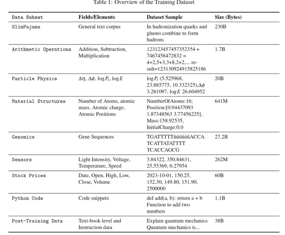 BigBang-Proton 选取了五个专业科学问题和通用语料进行预训练,包括五十位数算术运算,粒子对撞的喷注分类,材料原子间势能模拟(inter-atomic potential simulation), 水质预测,DNA/RNA/ 蛋白质联合建模。算术运算能力是 LLM 理解其他所有科学任务的基础,居于中心位置。其他四个科学任务都是其所在学科最核心的任务,该学科的诸多问题都可以从此任务延伸解决。