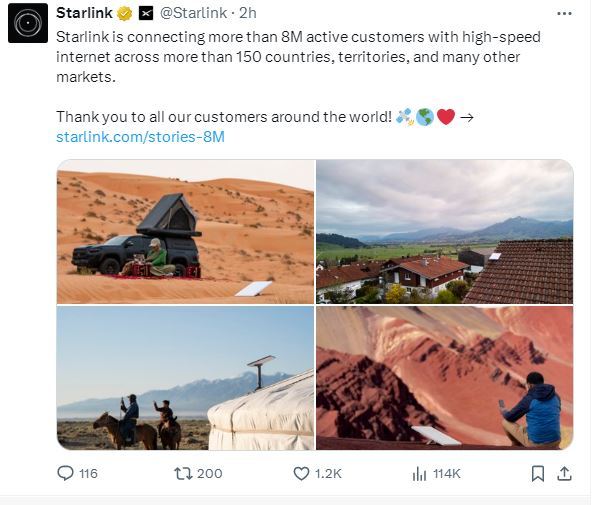 11月6日,马斯克的卫星互联网服务星链(Starlink)在X上的官方账号宣布,其全球用户数量已突破800万,“星链高速互联网服务现已覆盖全球超过150个国家、地区及众多其他市场,为超过800万活跃用户提供网络连接。”