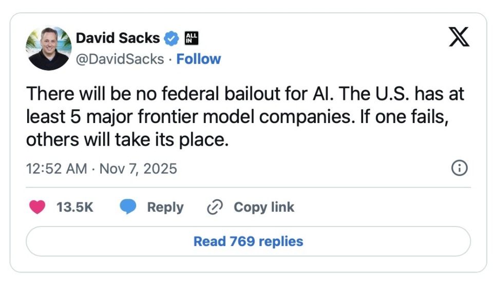 随后,美国前总统特朗普的AI事务负责人大卫·萨克斯(David Sacks)在X平台上表示,美国政府无意救助任何AI公司:“不会有联邦层面的AI救助计划。美国至少有五家领先的AI模型公司,如果其中一家失败,其他公司会继续发展。”