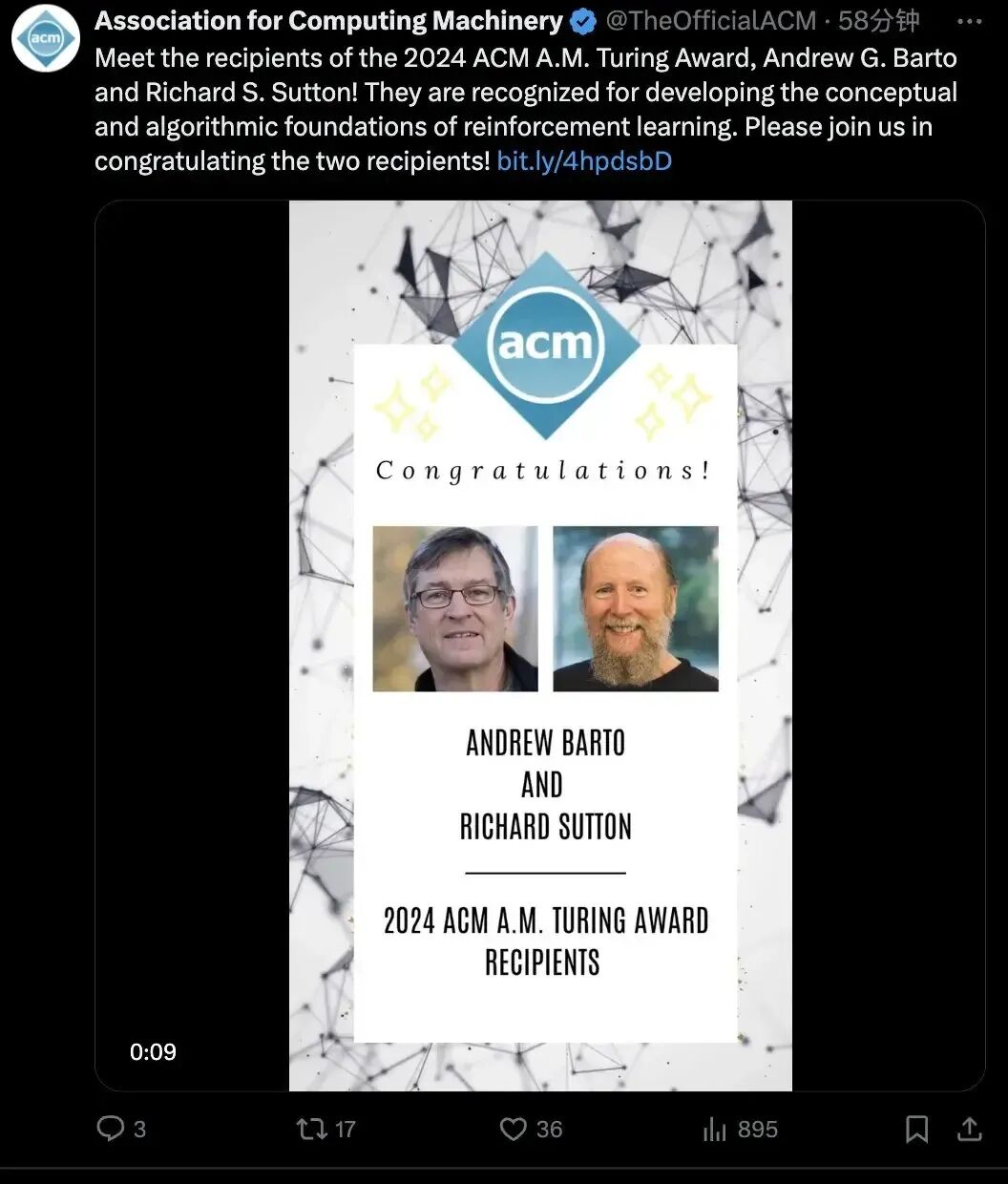 Sutton的医生获誉无数。他曾与Andrew Barto共同获得2024年图灵奖,以表彰他们在强化学习领域的奠基性贡献。