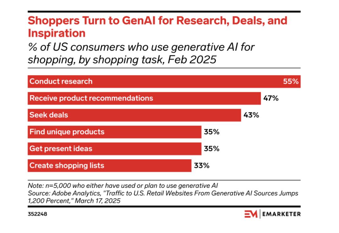 eMarketer预测,ChatGPT今年将拥有7710万美国用户,占GenAI用户的近66%、Adobe数据显示,53%的消费者计划今年通过GenAI购物,大多数消费者正在转向GenAI进行产品研究(55%)和推荐(47%)。
