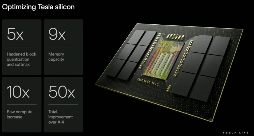 支撑这些现实世界 AI 的,是更底层的芯片系统。这次股东大会还披露了一些 AI5 芯片的细节:相较 AI4,AI5 将实现 9 倍内存容量、10 倍计算能效、50 倍总性能提升,能耗仅为英伟达 Blackwell 的 1/3,成本不到 1/10。