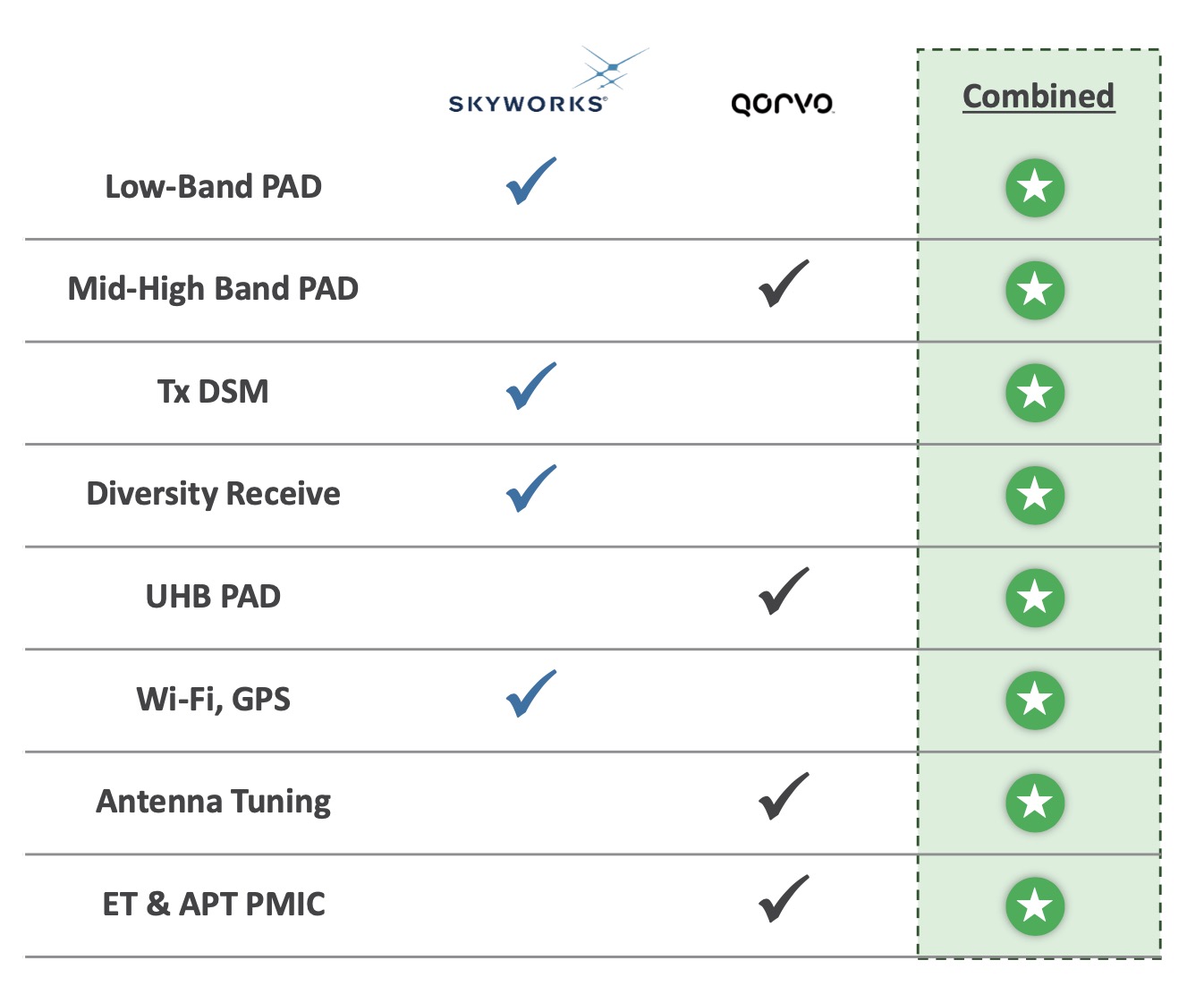 在业务方面,合并后预计将形成51亿美元规模的移动业务板块,覆盖从低波段到中高频段的全场景射频需求。Skyworks在低波段PAD、Tx DSM、Wi-Fi/GPS等领域的优势,与Qorvo在中高频段PAD、天线调谐、ET/APT PMIC等产品的专长形成互补,可一站式满足iOS与Android终端厂商的复杂射频需求,减少单一产品周期波动对营收的影响。