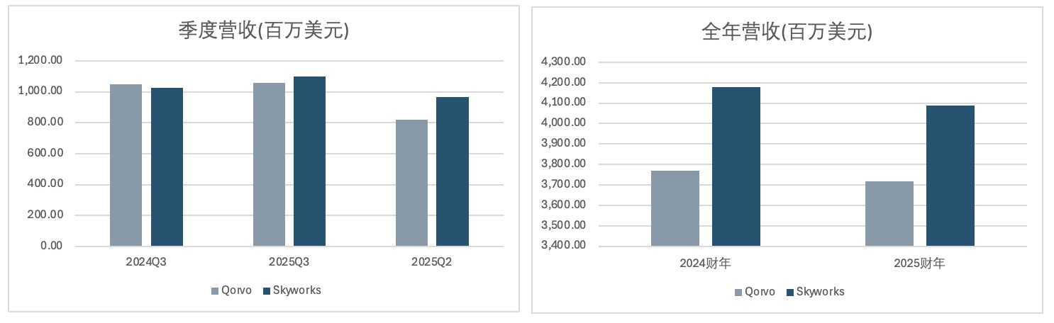 从全年规模来看,2024财年Skyworks全年营收41.78亿美元,Qorvo为37.70亿美元;2025财年双方营收均有所下滑,分别为40.87亿美元与37.19亿美元,合并后按 LTM(截至2025年6月30日)口径计算,总营收将达77亿美元,形成足以支撑全球市场竞争的规模体量。