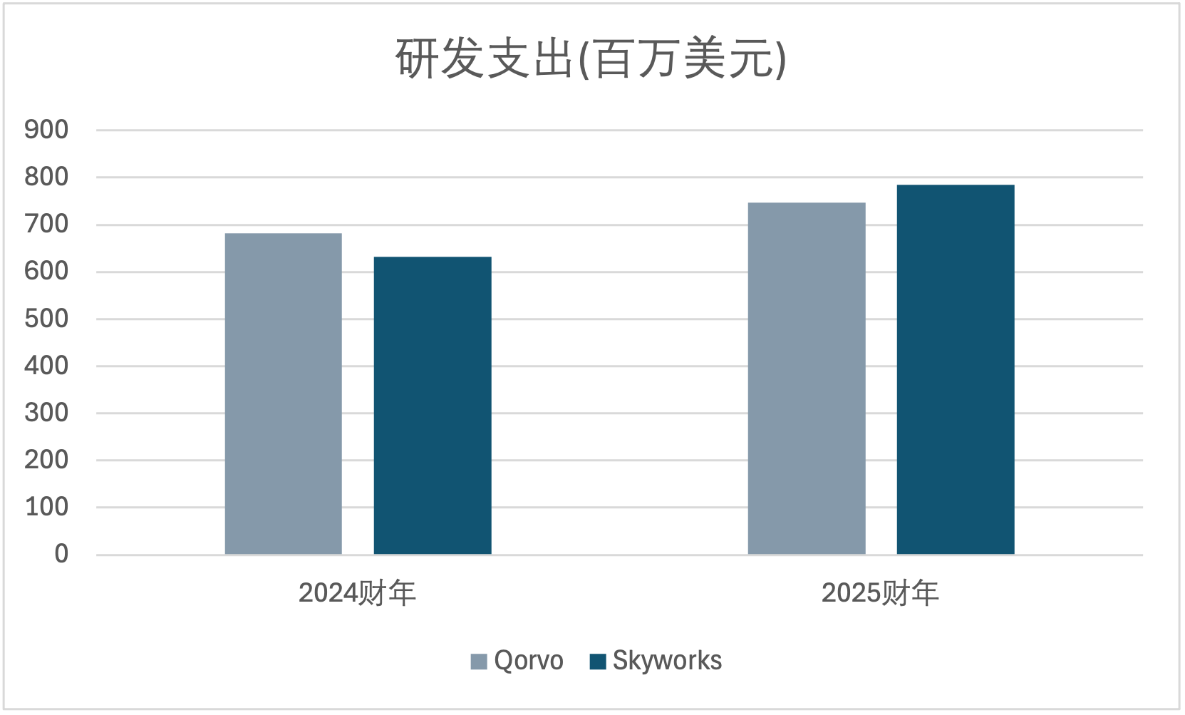 研发投入是射频芯片企业的核心竞争力,两家公司在这一领域的布局高度契合合并后的战略需求。2024财年,Qorvo研发支出6.82亿美元,2025财年增至7.48亿美元;Skyworks同期研发投入从6.32亿美元提升至7.86亿美元,合并后年度研发投入将达15亿美元(GAAP口径)。持续增长的研发开支背后,还有双方合计超12000项全球专利的技术储备,以及8000名工程师组成的技术团队,为合并后攻克下一代射频技术奠定了坚实基础。