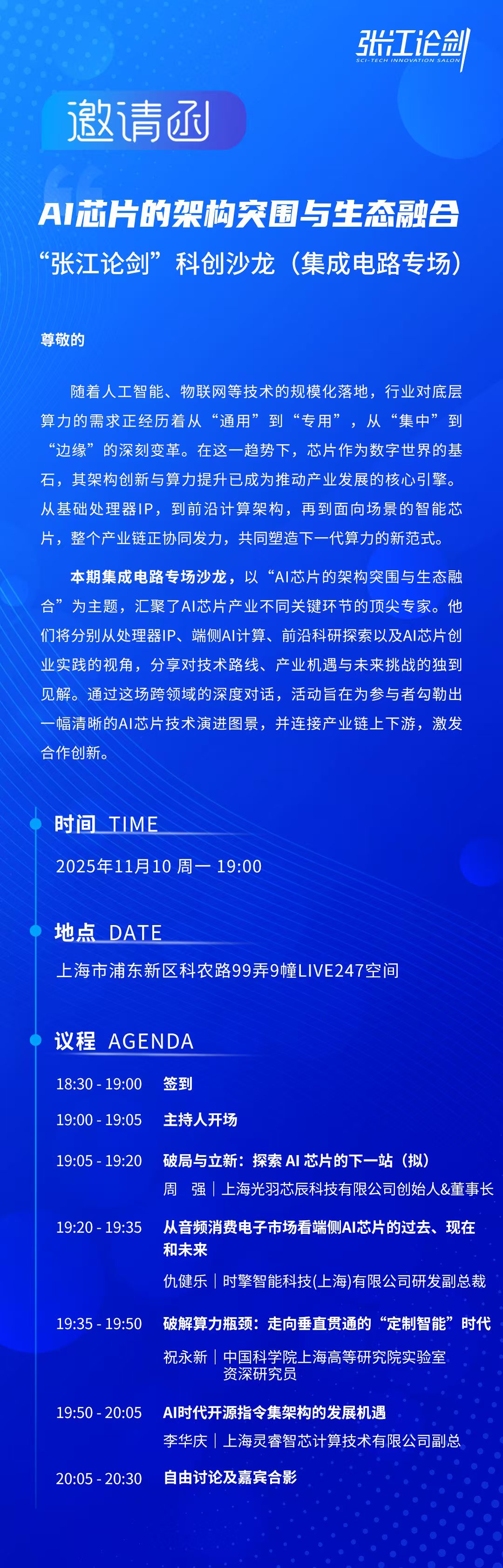 2025年11月10日晚,由张江科建办举办的 “张江论剑”科创沙龙(集成电路专场) 将在上海市浦东新区科农路99弄9幢LIVE247空间举行。本期活动以 “AI芯片的架构突围与生态融合” 为主题,共同探讨下一代算力的技术路径与产业机遇。