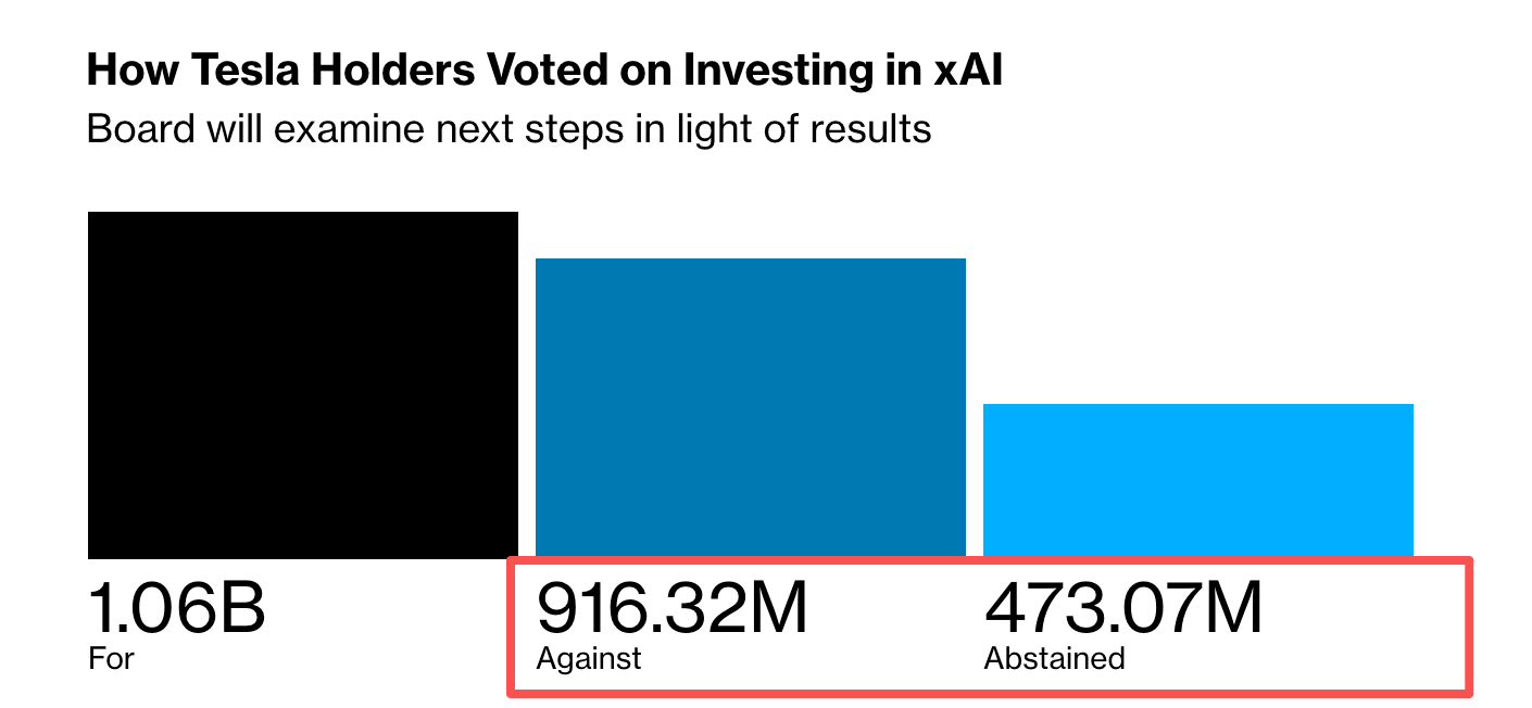 根据特斯拉周五晚间提交的监管文件,这项不具约束力的提案获得了10.6亿张赞成票,超过了9.163亿张反对票。然而,有超过4.73亿张投票选择弃权,是今年所有其他提案弃权票数的两倍以上。