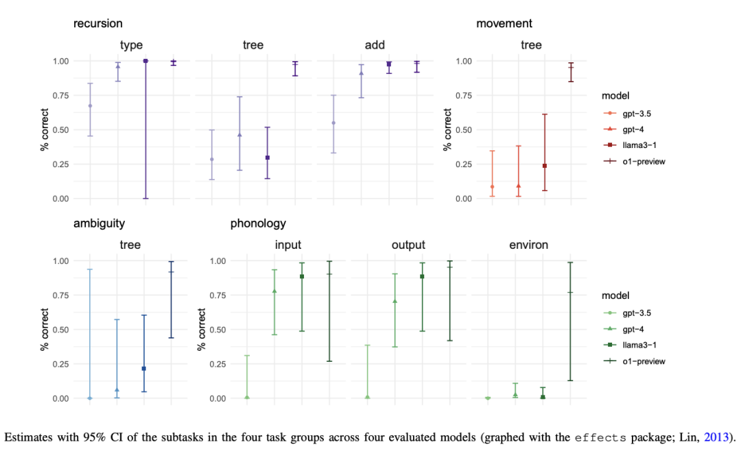然而该研究表明,o1可正确识别两种结构,并为每种生成了符合语言学规划的句法树。其他模型(如 GPT-4、Llama 3.1)只会生成不合语法的结构,还会对语义产生误解。