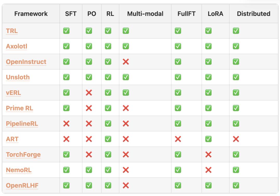 而在后训练的实战阶段时,需要做很多事情,比如选择后训练框架、工具等。不同的框架各自支持不同的算法类型、微调方法、可扩展能力等。