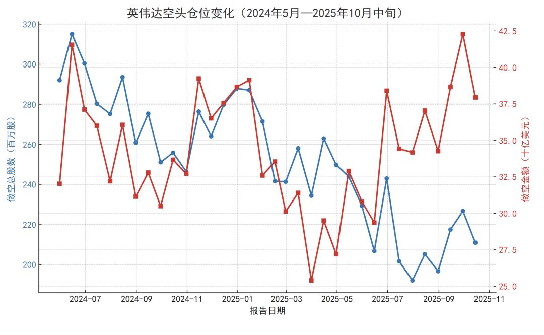 从2024年6月底到2025年10月15日,英伟达空头头寸减少超过1亿股(蓝线)