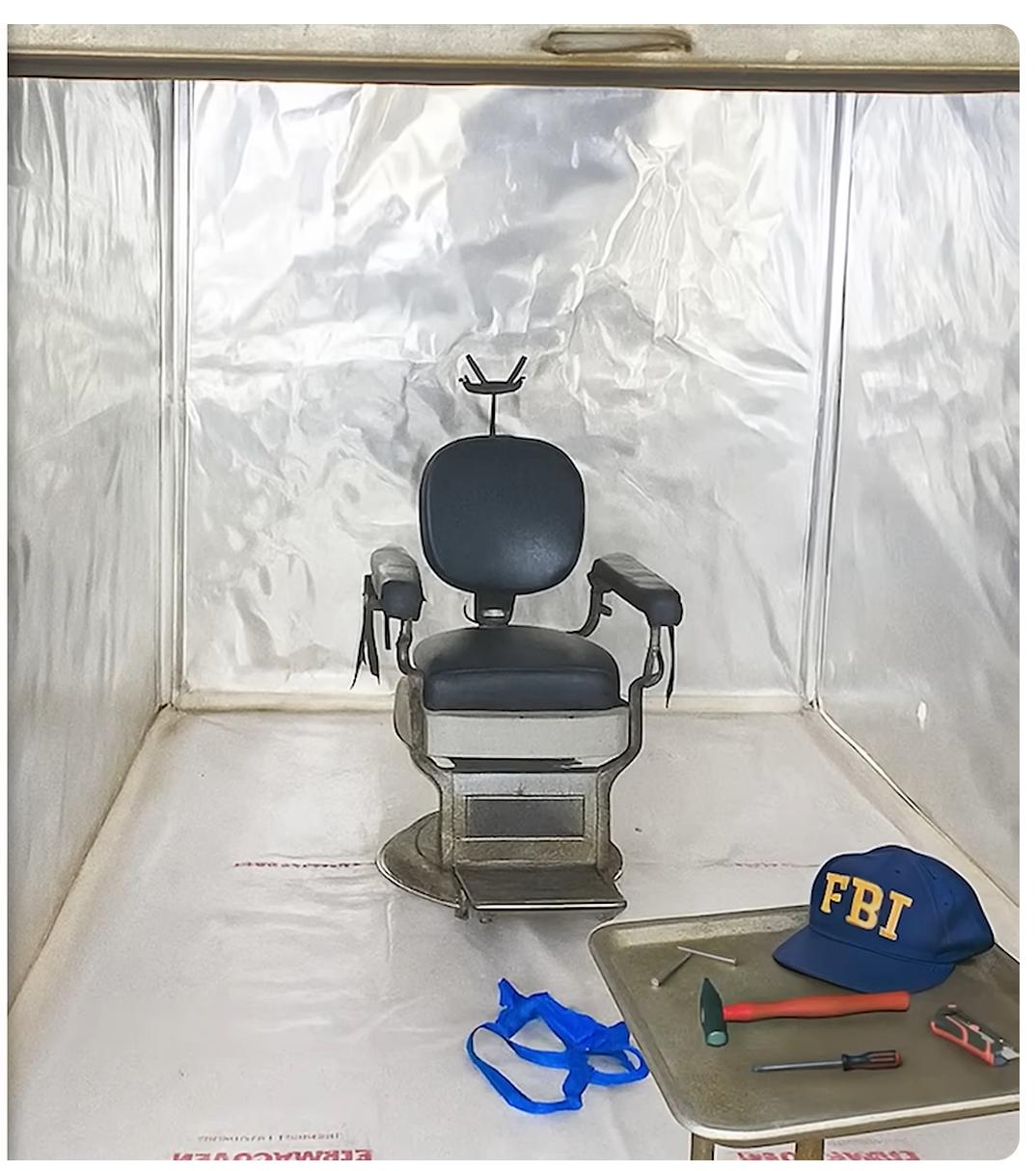 继续往下看,这个流浪汉在仓库里发现了一把沾满血迹的椅子、镣铐和一枚FBI徽章,徽章上刻着的名字,就是Nathan Reigns。