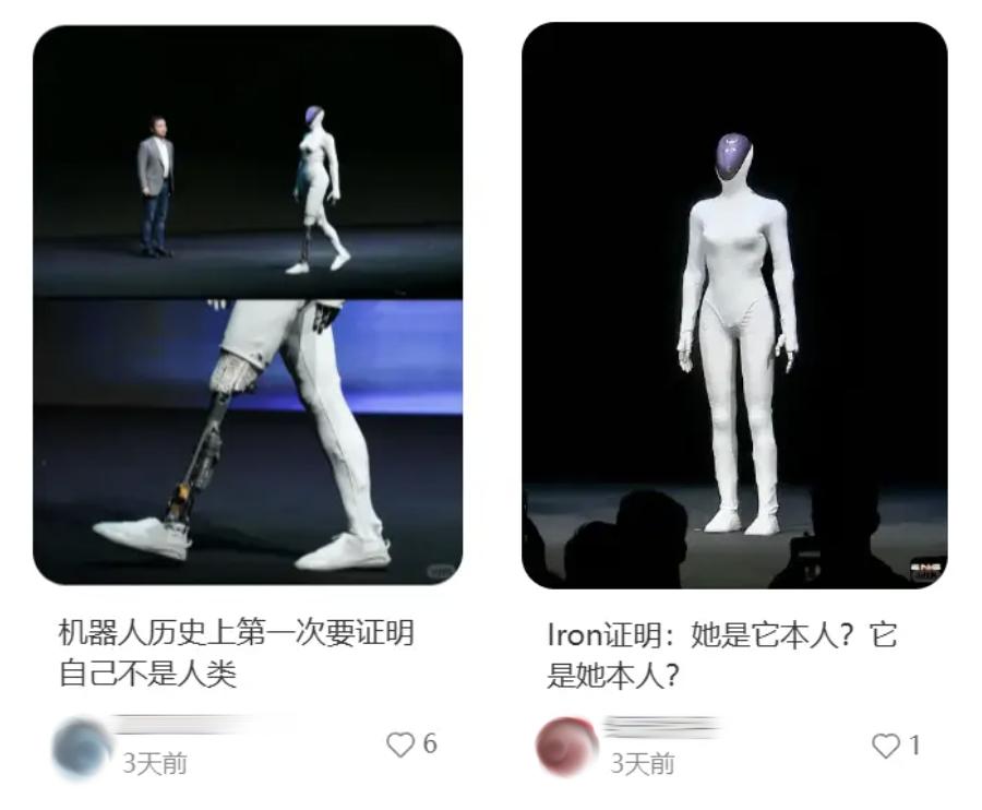 除了硬件和软件上的难题,人形机器人要获得市场接受也绕不开一些技术之外的问题。社交媒体上对于小鹏IRON机器人的讨论,就从最初的“太像人”,逐渐转移到了“为什么要这么像女人”?