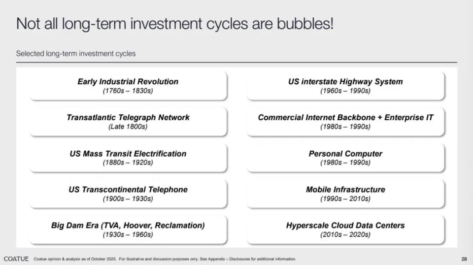 历史上,许多被认为是“泡沫”的现象——如互联网、电力、云计算——最终都演变成了长期存在的基础设施。Coatue认为,AI 正在沿着同样的路径发展:从短期的投机热潮,迈向长期的生产力革命。