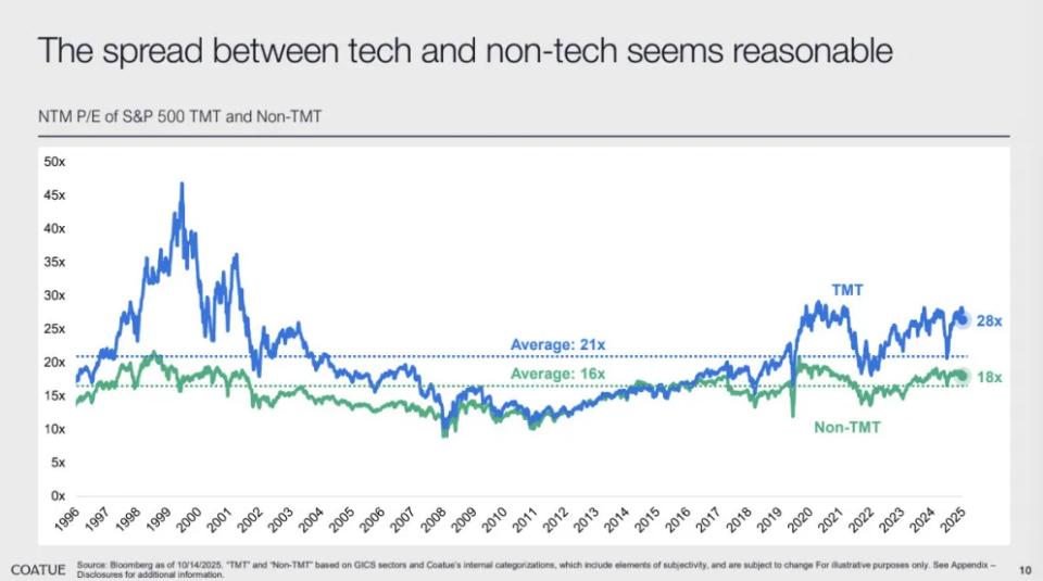 Coatue还预测,AI驱动型科技企业有望占据美国股市总市值的75%,延续科技板块自1980年代约20%的占比一路攀升至当前40%以上的长期趋势。