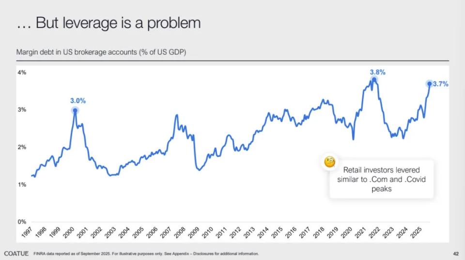 散户投资者杠杆交易再度上升,借钱炒股的水平接近疫情后的高点。Coatue指出,这是系统中少数几个值得关注的风险信号之一,反映部分投资者已出现过度乐观倾向。