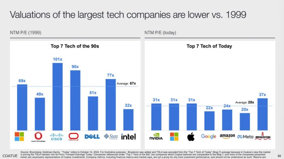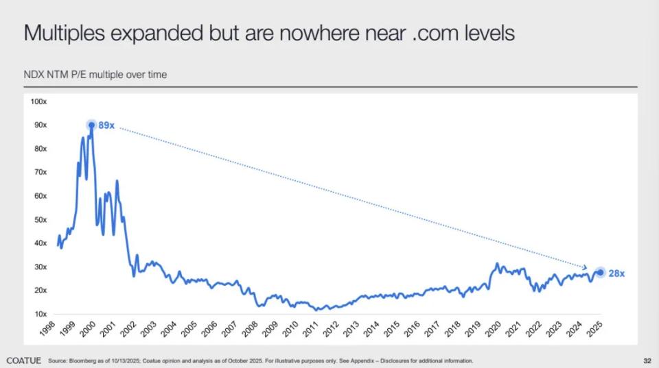 1999年,美国七大科技公司的平均市盈率高达67倍;而到 2025 年,这一数字约为28倍。更重要的是,这些公司的资产负债表更稳健、现金流更充裕。