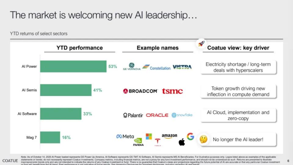当前市场格局正在发生深刻变革:能源、半导体和云基础设施已成为投资回报最高的板块,标志着市场增长引擎正从“AI软件”全面转向“AI算力”。