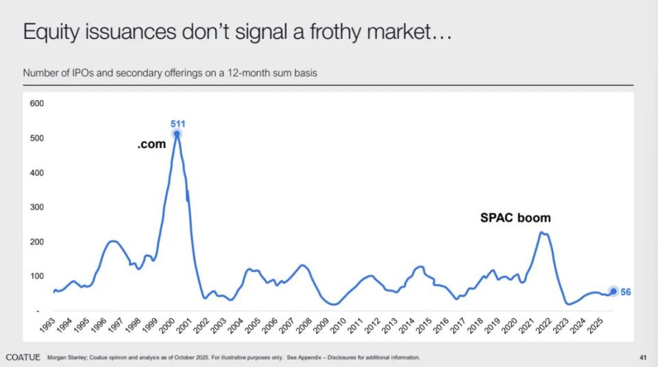 支撑这一判断的理由包括:头部企业的利润和现金流在中期内足以支撑其估值;2025年全球一级市场并未呈现失控式狂热(IPO仍处低位且分化明显),与历史泡沫顶峰时期截然不同;全民杠杆和过度融资也未达到极端程度。