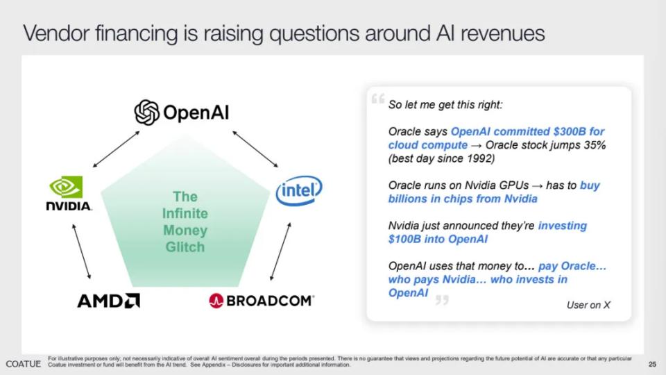 OpenAI、英伟达、甲骨文等公司正形成一种投资与支出相互推动的循环经济。Coatue戏称这是一种“无限金钱漏洞(Infinite Money Loop)”——只要投资回报率能够持续提升,这个循环就能不断自我强化。