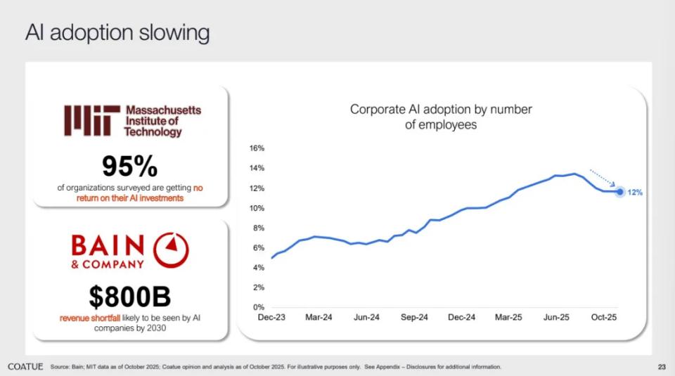 企业对AI的采用率从5%在短时间内跃升至13%,但近期增长有所放缓。Coatue认为,这并不意味着热潮退去,而更可能是企业级整合前的过渡期。
