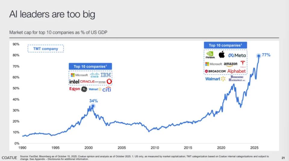 目前,美国前十大公司的市值总和已相当于GDP的77%,而在互联网泡沫时期,这一比例仅为34%。