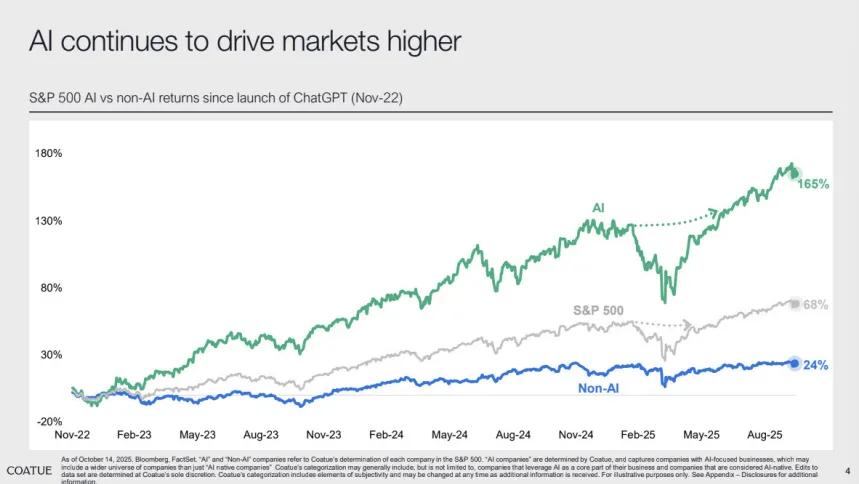 自ChatGPT问世以来,AI概念股相对标普500指数的超额收益已突破160%。Coatue将这一现象定义为“AI溢价”,并强调其背后有着坚实的产业基本面支撑。