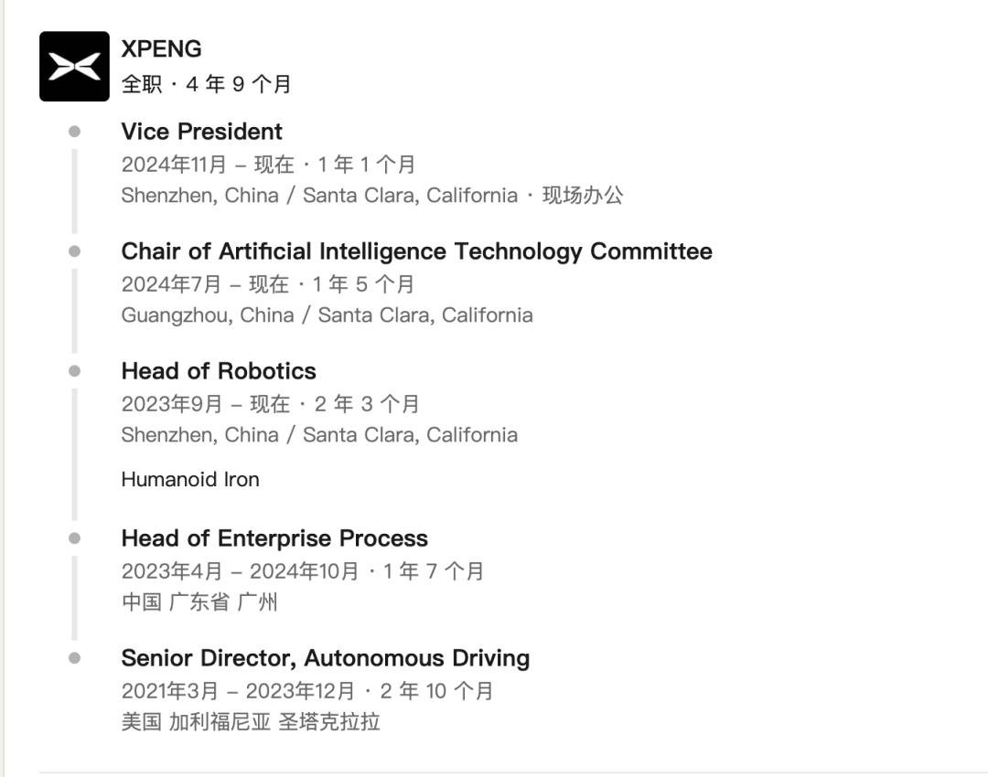 此后,他进一步出任小鹏汽车AI技术委员会主席,并晋升为公司副总裁,正式成为小鹏智能战略的核心人物之一。