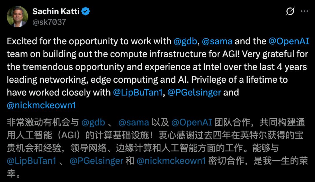 今天一早,英特尔CTO兼首席AI官Sachin Katti突然宣布离职。