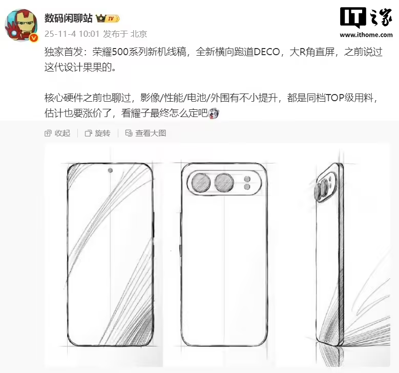 据IT之家此前报道,爆料称某款中屏新机(被猜测为荣耀 500 Pro)将搭载骁龙 8 至尊版芯片,并配备高达 8000mAh 的电池、2 亿像素主摄、潜望镜头、金属中框和超声波屏幕指纹等,在外观设计上,曝光的线稿显示新机将采用“全新横向跑道 DECO”和大 R 角直屏设计。
