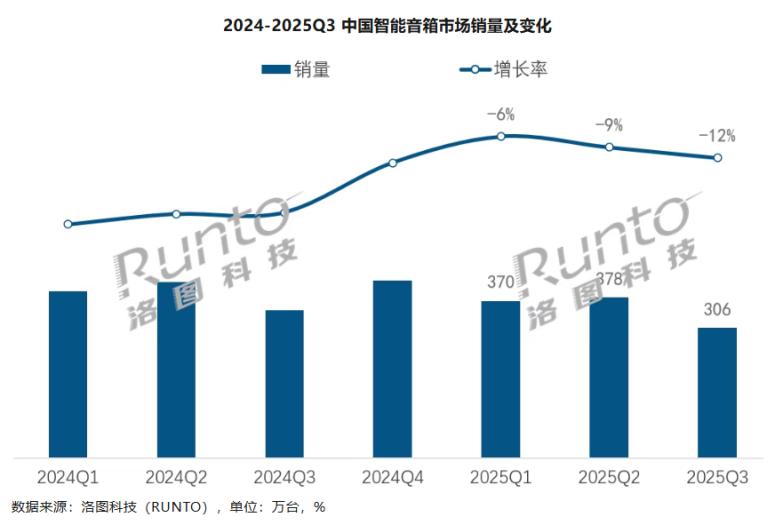 被科技巨头视为家庭生态入口的智能音箱卖不动了。根据洛图科技最新数据显示,2025 年第三季度中国智能音箱全渠道销量仅305.7万台,同比下滑11.9%,下滑幅度较今年上半年的5.6%进一步扩大。