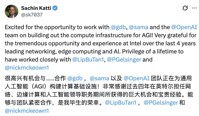 Sachin Katti 随即转发并回应道:“很高兴有机会与 @gdb、@sama 以及 @OpenAI 团队一起为 AGI 构建计算基础设施!同时非常感激过去四年在英特尔领导网络、边缘计算和 AI 项目所获得的宝贵机会和经验。能与 @LipBuTan1、@PGelsinger 和 @nickmckeown1 密切共事,是人生难得的荣幸。”