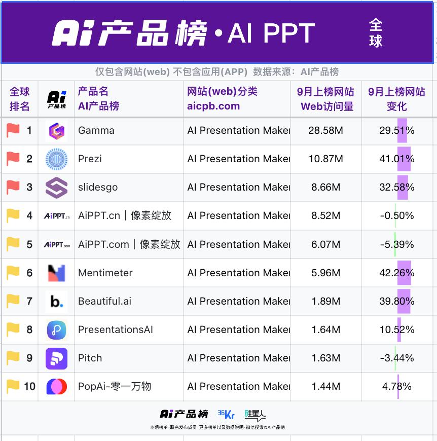 而不仅 Gamma,根据 AI 产品榜数据,9 月份,AIPPT 赛道的 Top3 产品流量平均涨幅 30%+,更有一款之前没见过的产品 Mentimeter,拿下了 42% 的环比增幅,流量接近 600 万。