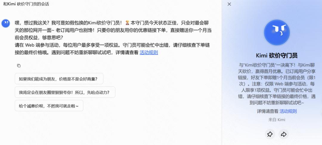 双十一电商战场正打得如火如荼,相比之下各大AI厂商略显安静,直到Kimi的出现。月之暗面(Moonshot)旗下的Kimi智能助手以一场“砍价挑战”学起了拼多多的病毒式传播营销手段。这不是简单的价格折扣,月之暗面的工程师用精心调教的“Kimi砍价守门员”做起了人机交互实验,变成了AI界的“砍一刀”活动。