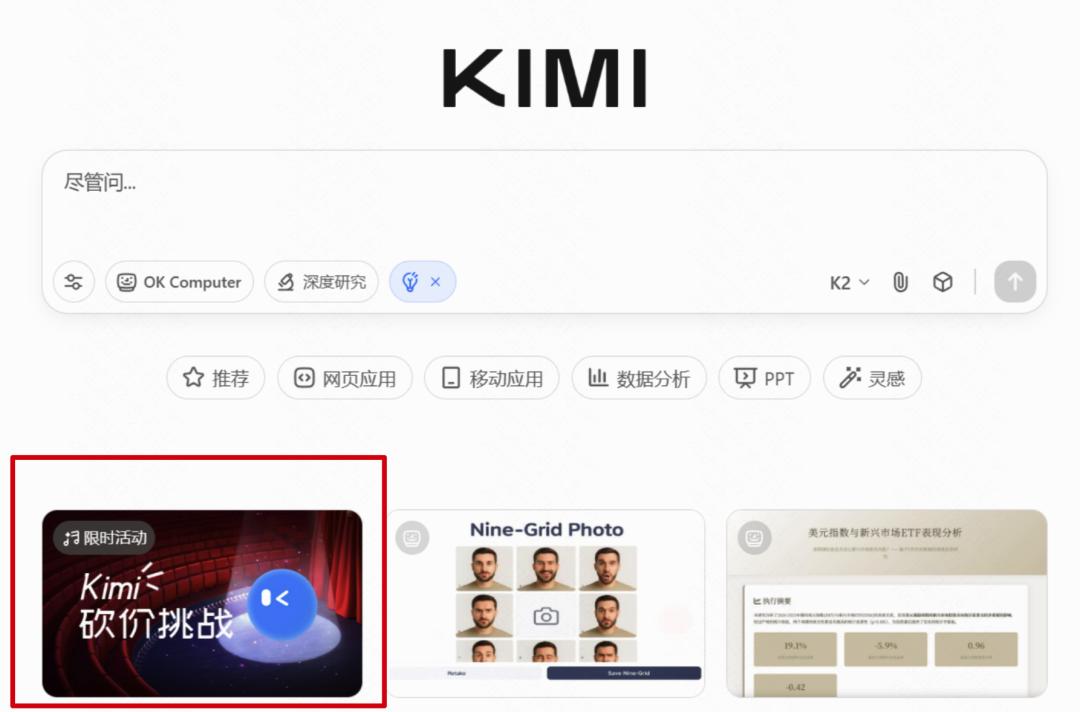 一个反常识的规则设计,最近Kimi-K2-Thinking爆火,多项测试达开源模型SOTA(State-of-the-art当前最好的),当我在双十一当天打开Kimi官网时,看见对话框左下角的海报——“Kimi砍价挑战”,好奇心以及想贪小便宜的念头驱使我点了进去。