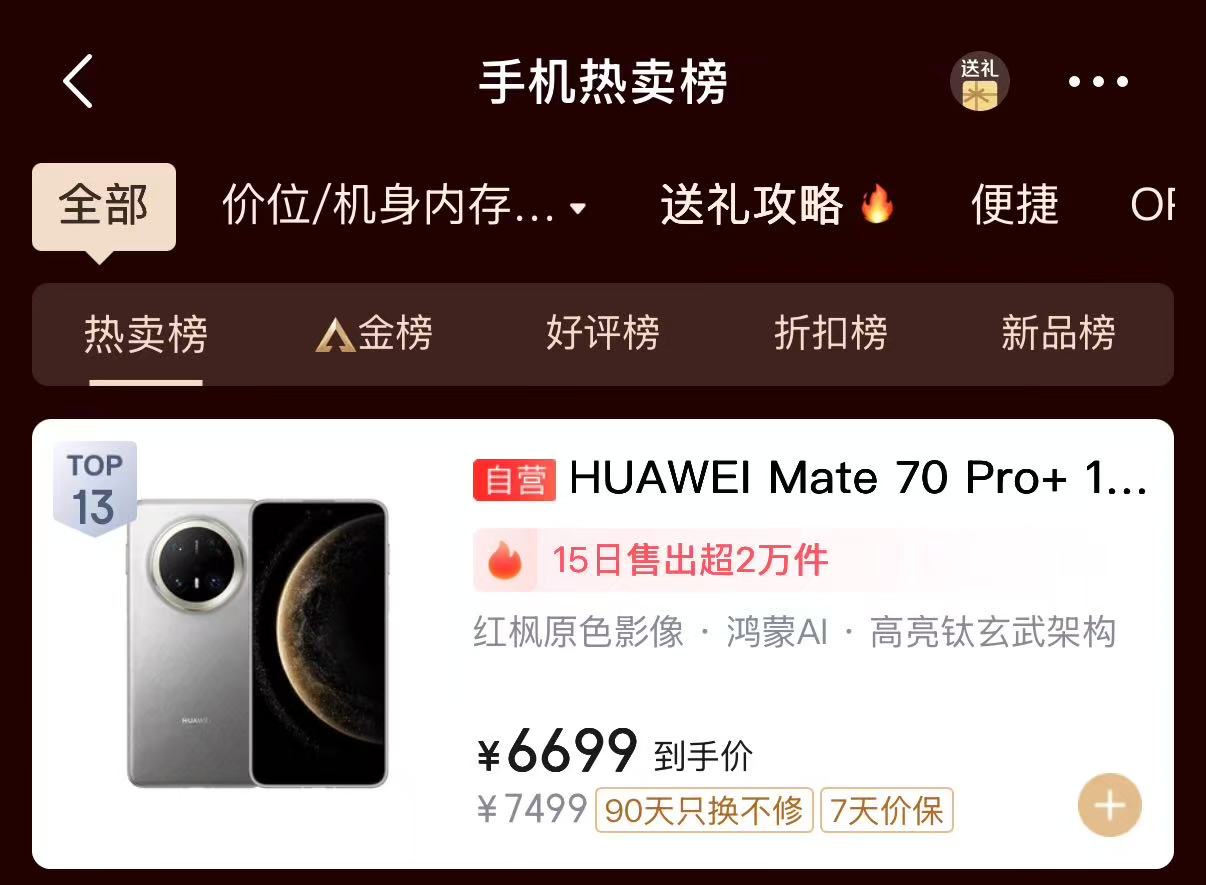 作为排名前五手机厂商里唯一没有在9、10月推出新旗舰的品牌,华为硬是靠着口碑炸裂的Mate70系列和Mate X6折叠屏在双11销量榜上夺得第五名的好成绩。