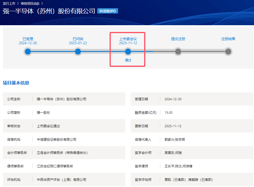 11月12日,科创板上市委审议结果出炉,强一半导体(苏州)股份有限公司(下称“强一股份”)首发申请符合发行条件、上市条件和信息披露要求。