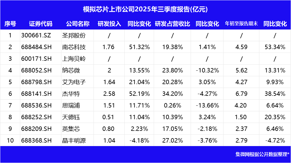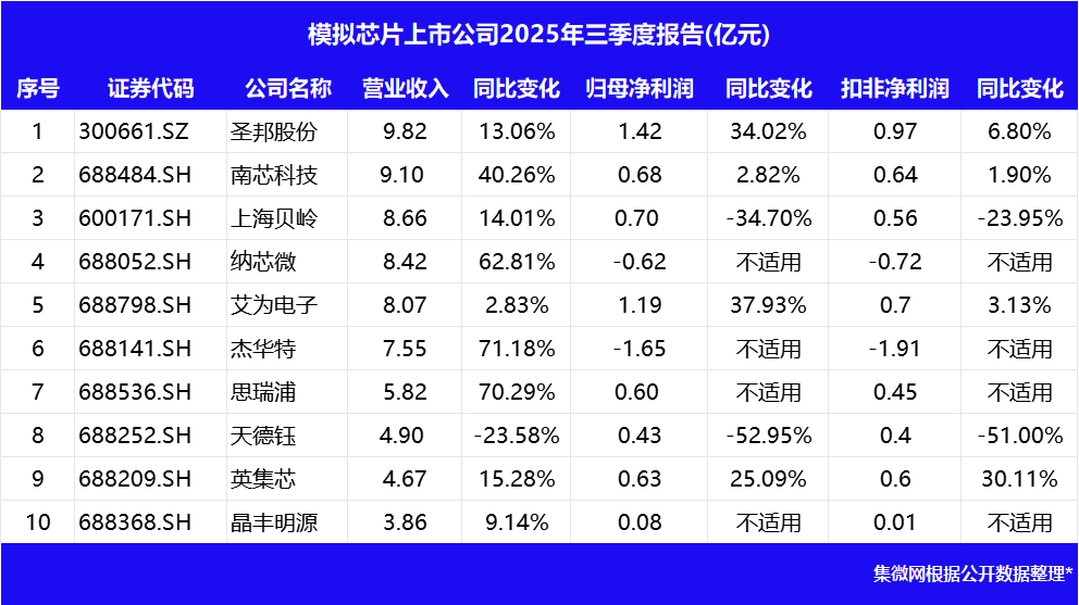 2025年三季度,10家模拟芯片厂商合计营收达70.87亿元。