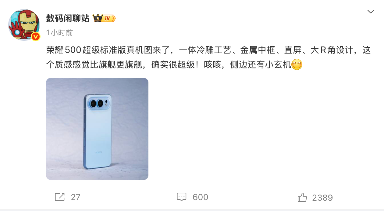 镜头模组的全新横向 Deco 设计同样值得关注。数码博主 @数码闲聊站 曝光荣耀 500 超级标准版真机图显示,荣耀 500 将后置镜头以横向阵列方式排布,模组与机身背部融合度极高,打破了此前数字系列的纵向排布传统。这种设计不仅让整机视觉重心更均衡,更暗示了硬件升级 —— 横向排布通常能为其他硬件提供更充足的空间。