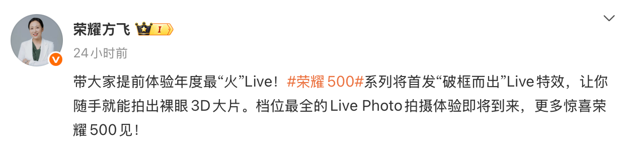 此外,荣耀终端产品线总裁方飞预热的“破框而出”Live 特效,宣称“档位最全的 Live Photo 拍摄体验”,甚至可能支持“裸眼 3D”效果,预示着荣耀将在影像玩法上带来更多创新。
