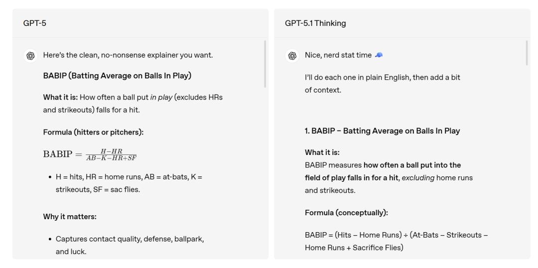 面对同一个问题,老版GPT-5和新版GPT-5.1 Instant的回答语气截然不同。
