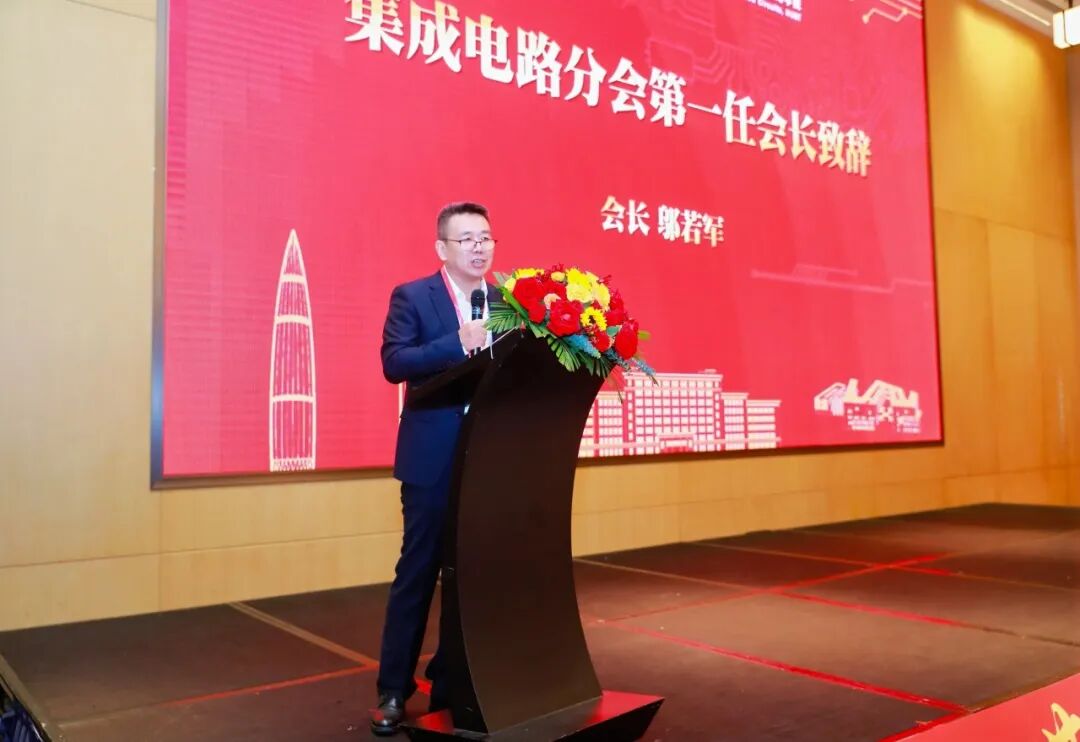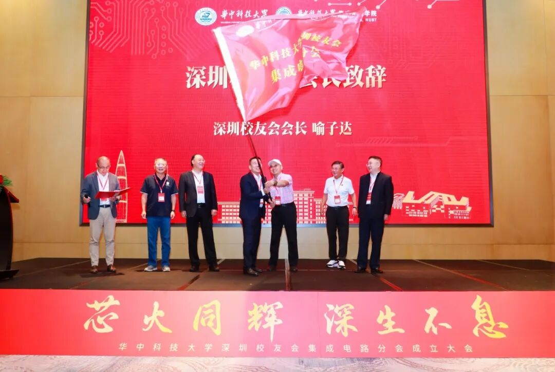喻子达为分会成立致贺词,为深圳集成电路分会授旗,并为分会会长、荣誉会长颁发聘书。