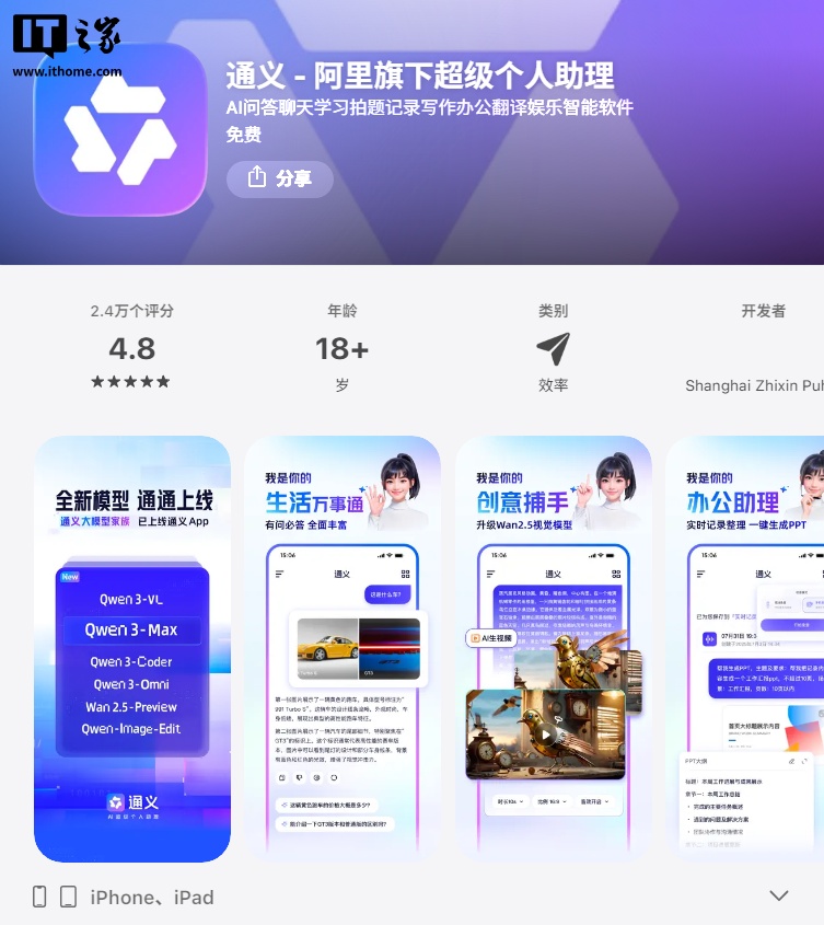 应用介绍显示,千问 App 是阿里最强大模型官方 AI 助手,是体验最新、最强 Qwen 大模型的第一入口。
