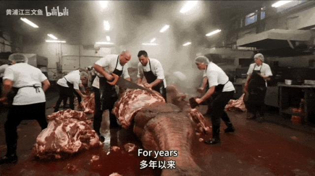 我只能至少看上去不像牛羊肉或者猪肉,毕竟这个沧龙是深海的生物,我想它是不是会跟鲸鱼的肉有些相似,因为水的压强会导致它的肉的颜色变得深红,质地比较紧实,吃上去比较老。看一下鲸鱼的肉可能比较像。感觉做到这个程度差不多。
