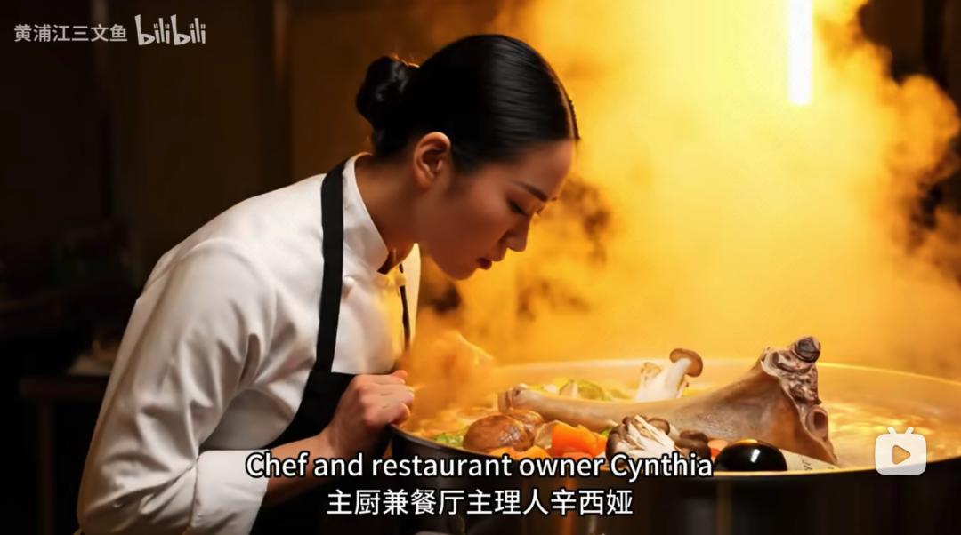 比如贯穿视频的各种热梗。首先登场的印度厨师做的“九转大肠”;中国厨师是来自上海的“辛西娅”,出场时自配背景音乐和解说,比如这句耳熟能详的“最高端的食材,往往只需要最简单的烹饪方式”……因为“三文鱼”深信“一定要有梗才能留住人”。