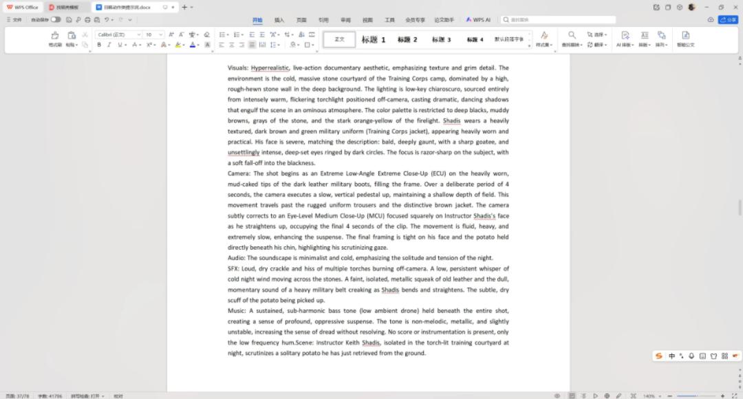 还有涉及到一些特效的部分,比如辛西娅半蹲下来挥出一掌,打出了一条龙,这个动作会比较复杂,毕竟是这么连贯的动作,加上还有特效,还要保证人物的一致性,这应该写了一页纸的word文档或者更多(提示词),还有龙拿着一个辣椒和一个松露在厨师面前喷火,这种特效画面的提示词会特别多。