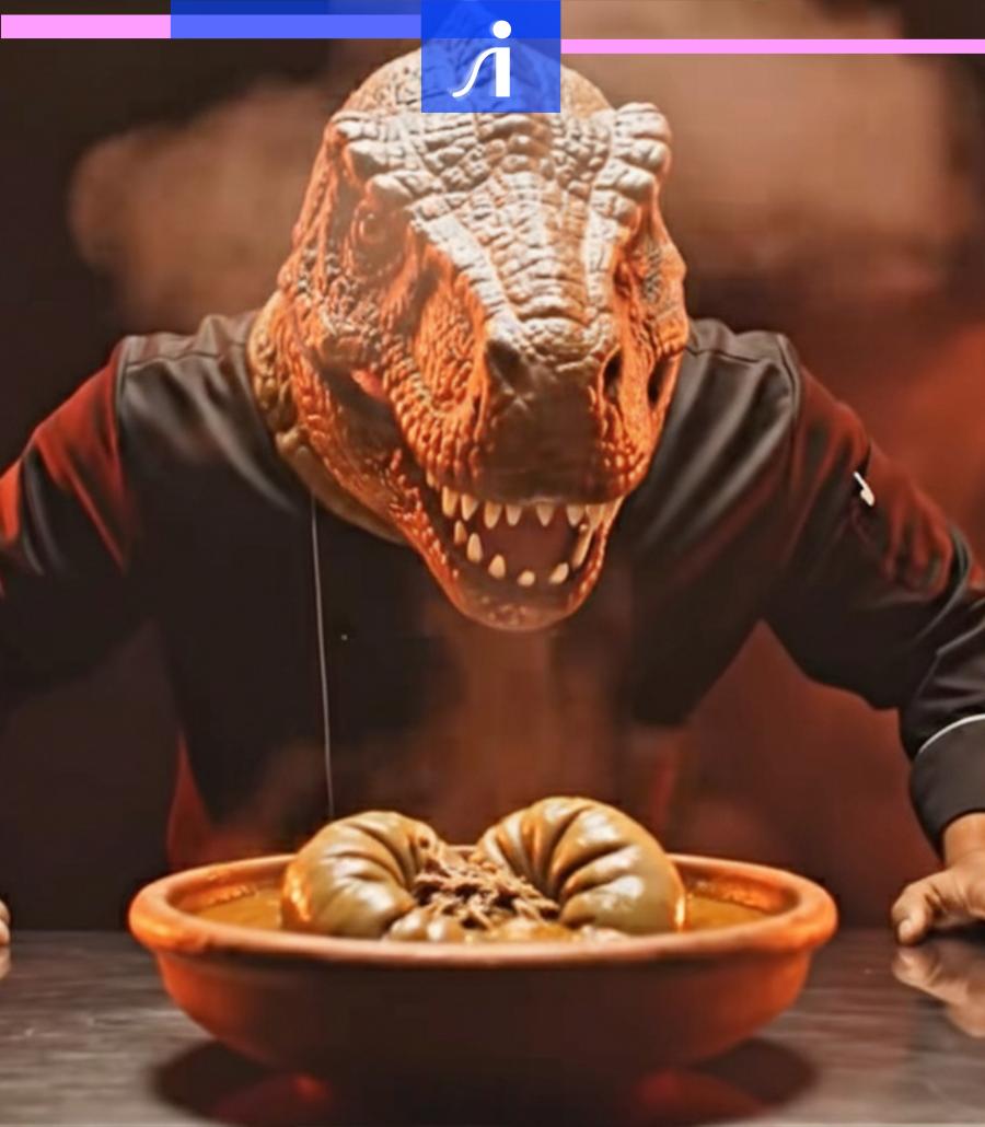 这条片子确实也跟以往的多数AI视频不一样,它不切石头也不是小猫做饭,而是几个国家的厨师进行一场烹饪比赛,食材则为一条沧龙。是的,沧龙——一种6500万年前就已经灭绝的远古生物——把它做成菜,没见过吧。