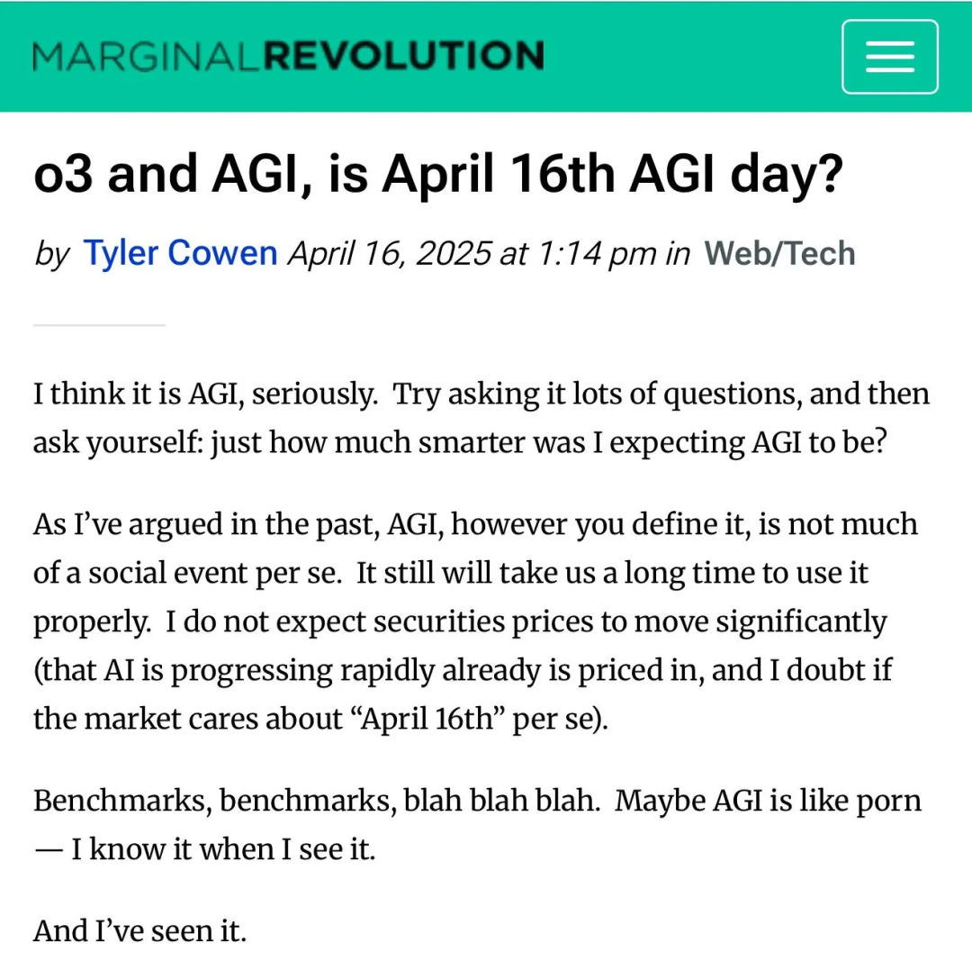 OpenAI发布o3之时,经济学家Tyler Cowen认为AGI已诞生,2025年4月16日就是AGI日。