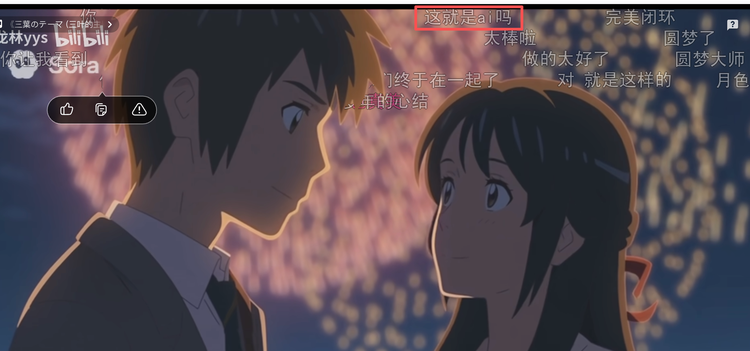 龙林首先做的就是用AI发糖。他让重逢的泷与三叶加上联系方式、约会、逛街、观赏烟花,说出“我喜欢你”,还让泷意识到自己跟三叶早就认识早有联系。粉丝们圆梦了,收获了新的满足和感动。